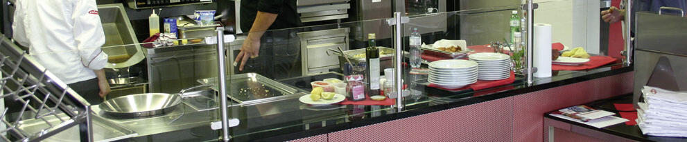 Showküchen-Infrastruktur mit modernsten Geräten der Gastrotechnik (MKN-/Rational-Steamer, Induktionsherdplatten, Induktionsgrill, Wok, Kipper, Schockfroster, Mikrowelle, Fritteuse, Abwaschmaschine , Kühlmöglichkeiten,etc.)